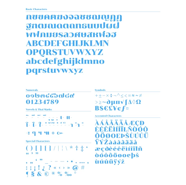 泰文展示字体均由传统的连笔 / 无连笔泰文字体简化而来,这类简化操作需把握恰当尺度,方能保留每个字符的原生形态特征。